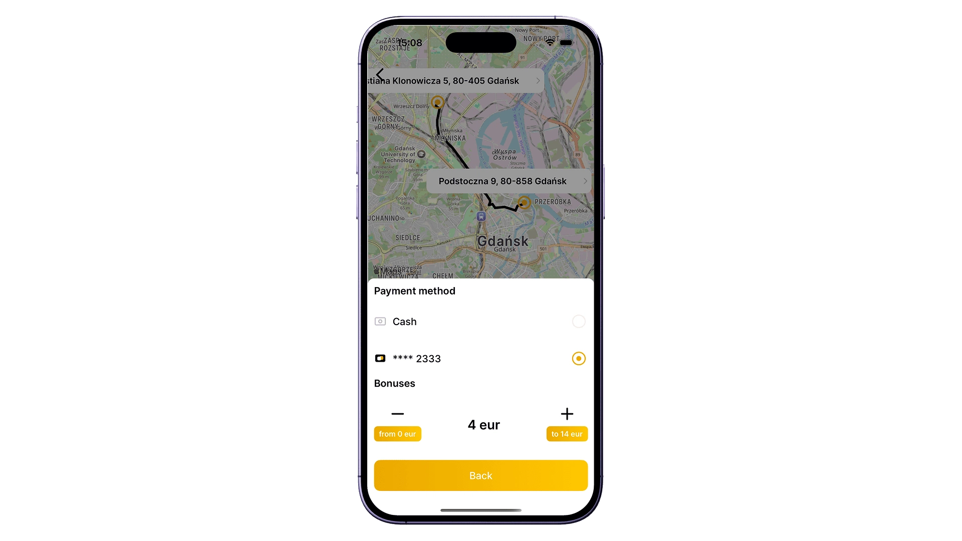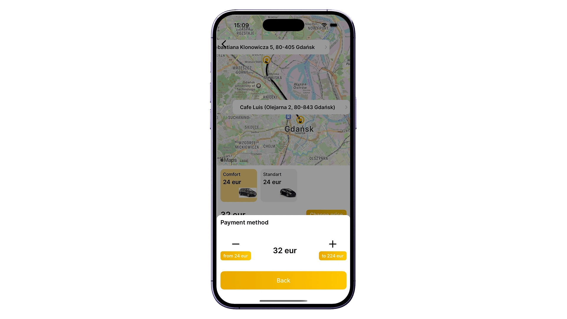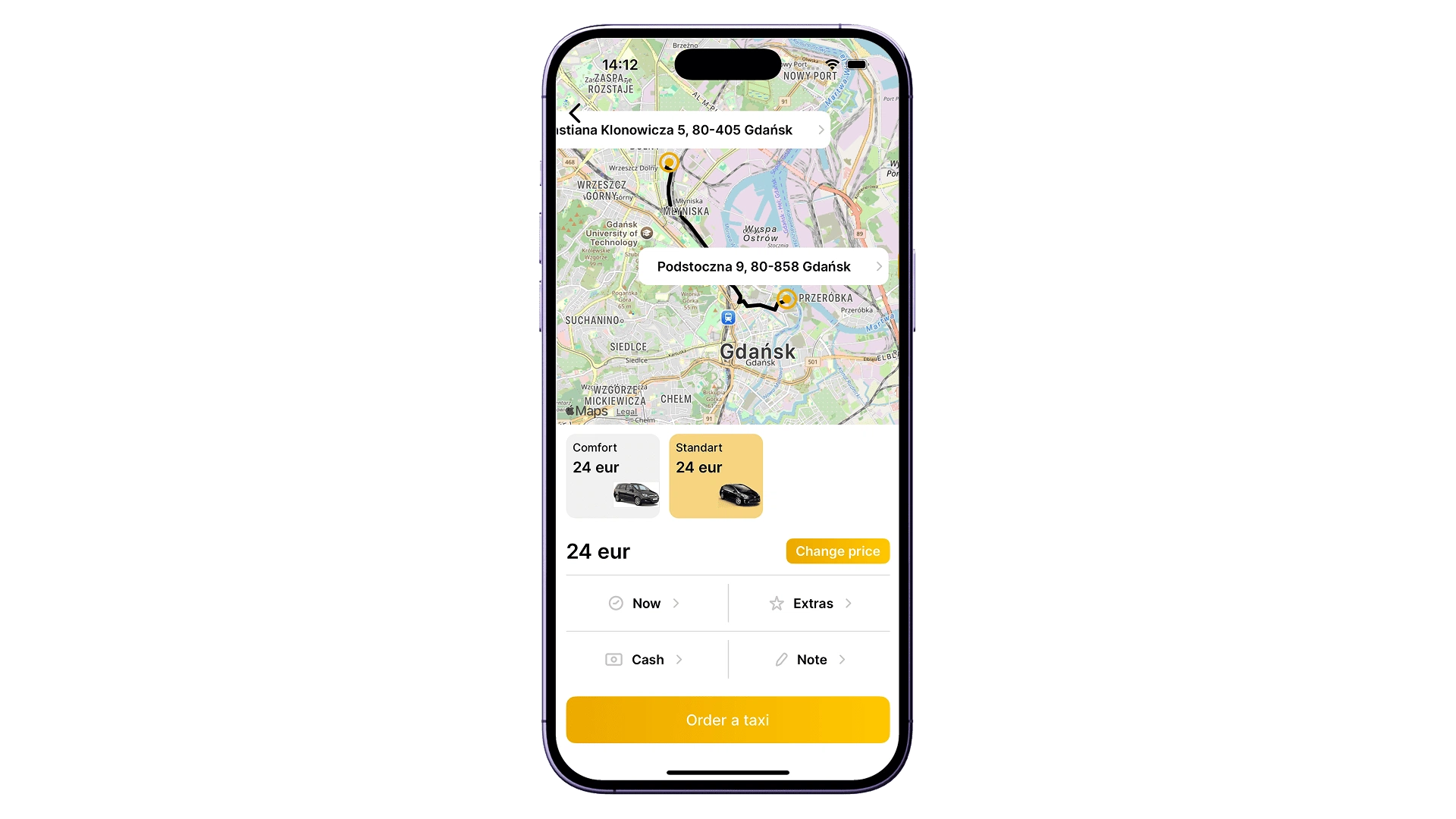 Twoja aplikacja automatycznie obliczy przybliżony koszt i czas przyjazdu samochodu, gdy klient wybierze na mapie punkty początkowy i docelowy.