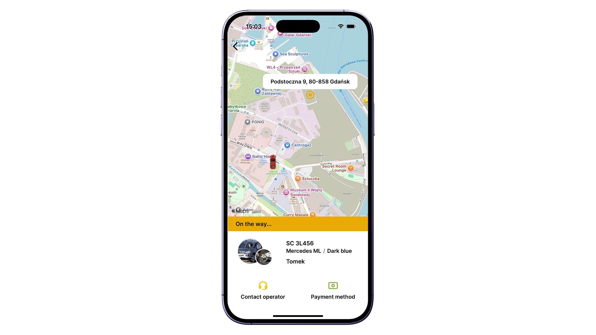 Po potwierdzeniu zamówienia Twoja aplikacja wyświetli na ekranie mapę z aktualnym ruchem samochodu i przybliżonym czasem dojazdu do miejsca odbioru.