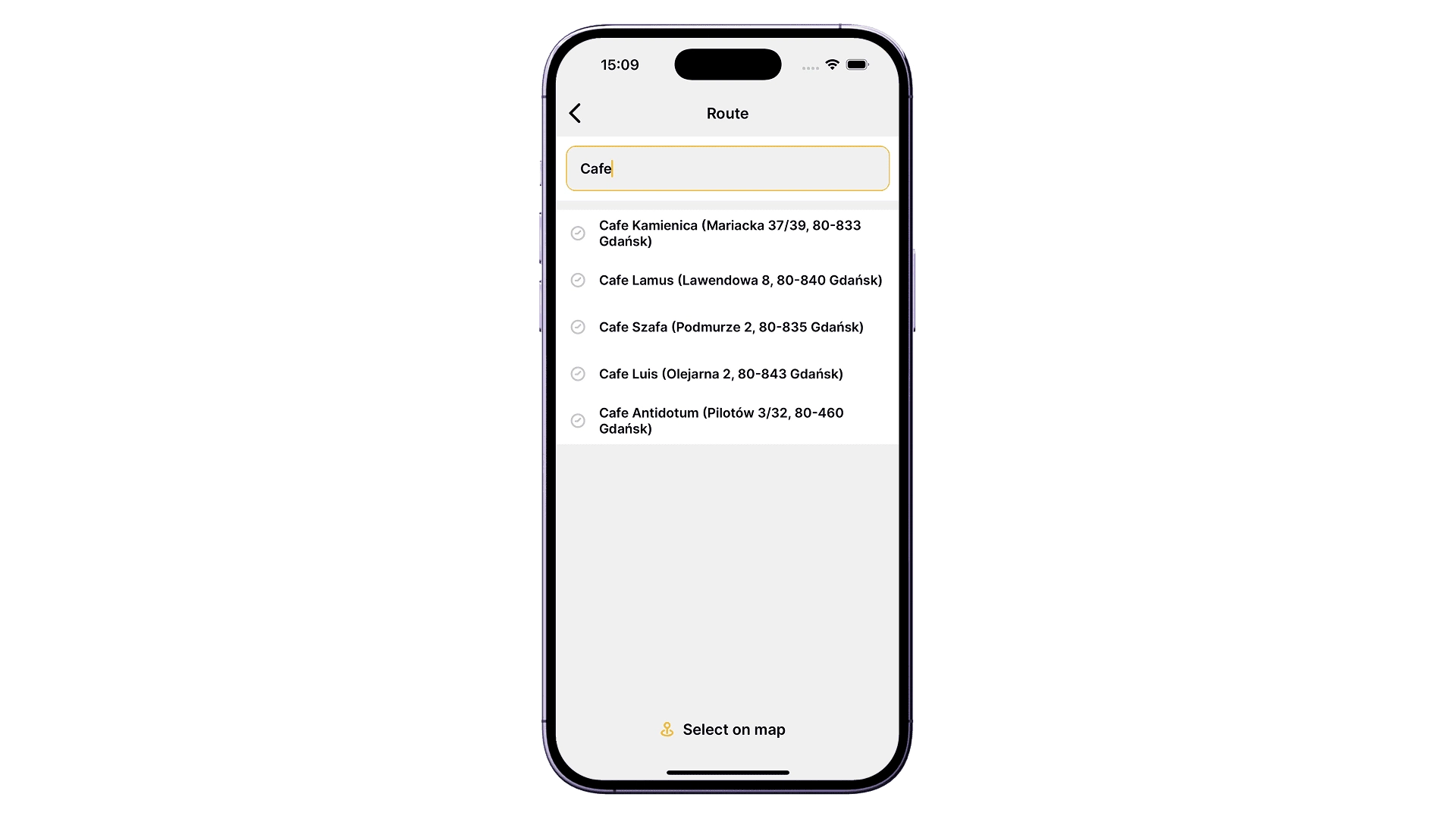 Błyskawicznie wybierz punkt odbioru i cel na mapie oraz zapisz adresy w 'Ulubionych' dla szybkiego ponownego zamawiania.